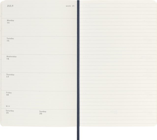 De Moleskine 18 Maanden Weekly Notebook Planner loopt van juli tot december. Deze populaire planner is ingedeeld om de afspraken van de week aan de linkerkant weer te geven en heeft een gelinieerde pagina voor notities en ideeën aan de rechterkant. Hierdoor is het notebook perfect voor studenten, docenten en professionals. De planner heeft een harde of zachte kaft met afgeronde hoeken en een elastische sluiting. - Zachte kaft - Afgeronde hoeken - Elastische sluiting - Moleskine ivoorkleurig papier - Papiergewicht: 70 g/m² - Handige tools: planning, tijdzones, internationale metingen, toegangscodes en vluchtduur - Wereldwijde feestdagenkalender verkrijgbaar via moleskine.com/diaryaddons - Uitbreidbaar binnenvak passend bij de kleur van het notebook - "In geval van verlies" label gedrukt op het schutblad - Bijpassende bladwijzer voor lint - Herbruikbare paperband B-SIDE met extra gedrukte tools - 180° liggende opening - Moleskine srl. creëert en verkoopt FSC-gecertificeerde producten