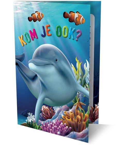 Vrolijkheid ten top zijn deze uitnodigingen met Dolfijn voor een kinderfeestje of verjaardag. Set van 6 kaarten, inclusief enveloppen.