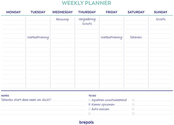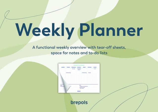 Brepols Weekly Planner, een handige ongedateerde weekkalender eentalig Engels met ruimte voor taken en notities, op wit papier met een formaat van 29,7 x 21 cm. De kleuren worden in willekeur uitgeleverd.