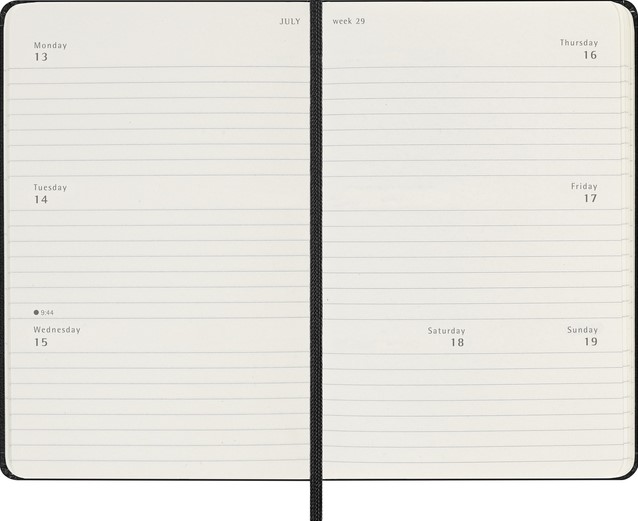 De Moleskine Horizontal Weekly Planner is gedateerd van januari tot december. Deze populaire planner is ingedeeld in een horizontaal formaat om elke week op twee pagina's te laten zien (maandag t/m woensdag aan de linkerkant, donderdag t/m zondag aan de rechterkant). De planner heeft afgeronde hoeken en een elastische sluiting. Gevuld met prachtige, ivoorkleurige pagina's, met genoeg ruimte voor uw eigen inbreng evenals handige tools. - Harde kaft - Afgeronde hoeken - Elastische sluiting - Moleskine ivoorkleurig papier - Papiergewicht: 70 g/m² - Handige tools: planning, tijdzones, internationale metingen, toegangscodes en vluchtduur - Wereldwijde feestdagenkalender verkrijgbaar via moleskine.com/diaryaddons - Uitbreidbaar binnenvak passend bij de kleur van het notebook - "In geval van verlies" label gedrukt op het schutblad - Bijpassende bladwijzer voor lint - Herbruikbare paperband B-SIDE met extra gedrukte tools - 180° liggende opening - Moleskine srl. creëert en verkoopt FSC-gecertificeerde producten