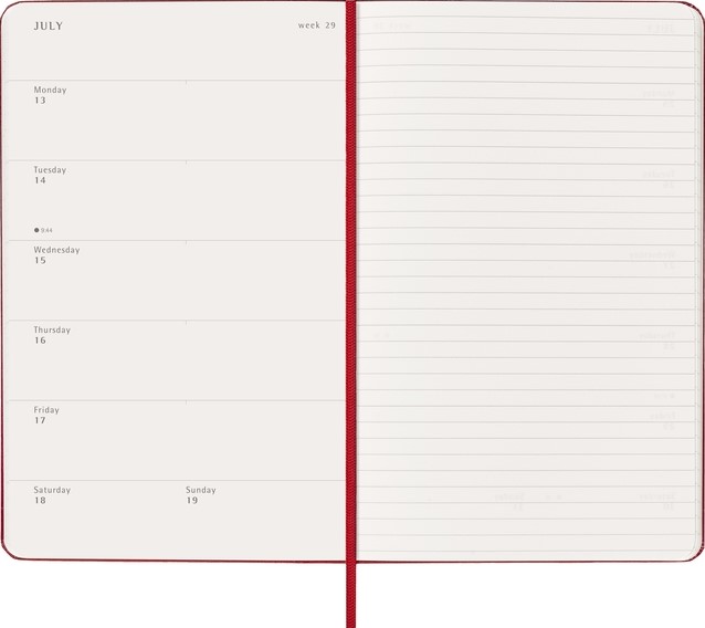 De Moleskine Weekly Notebook Planner is gedateerd van januari tot december. Het is een handige en veelzijdige planner die de vrijheid van een notitieboekje bevat en is ingedeeld met de afspraken van de week aan de linkerkant en een gelinieerde pagina voor notities op de rechter bladzijde. Het notitieboekje is beschikbaar met een harde of een zachte kaft met afgeronde hoeken en een elastische sluiting. - Harde kaft - Afgeronde hoeken - Elastische sluiting - Moleskine ivoorkleurig papier - Papiergewicht: 70 g/m² - Handige tools: planning, tijdzones, internationale metingen, toegangscodes en vluchtduur - Uitbreidbaar binnenvak passend bij de kleur van het notebook - "In geval van verlies" label gedrukt op het schutblad - Bijpassende bladwijzer voor lint - Herbruikbare paperband B-SIDE met extra gedrukte tools - 180° liggende opening - Moleskine srl. creëert en verkoopt FSC-gecertificeerde producten