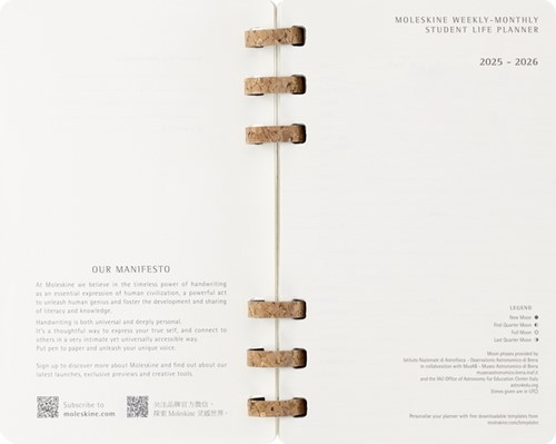 De Student Life Planner van Moleskine is ontworpen om de academische prestaties te verbeteren, georganiseerd te blijven en een gezonde balans tussen studie en privéleven te behouden. De planner bevat een maandelijkse en wekelijkse layout van twee pagina's om alles in te plannen, van dagelijkse afspraken en deadlines tot grote evenementen en langetermijnprojecten. Het boek biedt ruimte om roosters bij te houden, semesterdoelen en actieplannen in kaart te brengen en maandelijkse en jaarlijkse doelen te herzien. De Student Life Planner helpt ook bij het in evenwicht brengen van behoeften die verder gaan dan het academische leven met maandelijkse gewoontetrackers om te personaliseren, in te kleuren en aan te vullen, evenals een wekelijkse herinnering om je te concentreren op creativiteit en humeur. De planner is gedateerd van juli 2025 tot juni 2026 en de pagina's zijn gemaakt met papier van 100 g/m². Elke planner wordt geleverd met stickervellen en 3 bladwijzers om je planning te personaliseren.