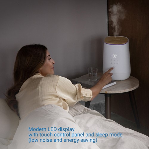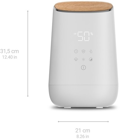 De lucht in de ruimte wordt efficiënt bevochtigd met ultrasone technologie, terwijl het geïntegreerde UV-C licht ziektekiemen en bacteriën in het water vermindert. Het LED-display met aanraakbediening kan worden gebruikt om de luchtvochtigheid individueel in te stellen tussen 45%-75% en de bevochtigingsintensiteit in drie fasen. Een geïntegreerde sensor controleert constant de luchtkwaliteit en past automatisch het geselecteerde vochtigheidsniveau aan.