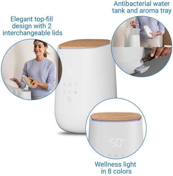 De 3-in-1 luchtbevochtiger biedt verschillende functies die uw welzijn binnen uw eigen vier muren vergroten. Het wellnesslicht in 8 selecteerbare kleuren creëert een ontspannen sfeer, terwijl de slaapstand zorgt voor stil, energiebesparend gebruik, zelfs 's nachts. Extra veiligheid wordt geboden door een instelbare timer van 1 tot 9 uur en automatische uitschakeling wanneer het waterreservoir leeg is. Ga lekker zitten en geniet van de verbeterde luchtkwaliteit!