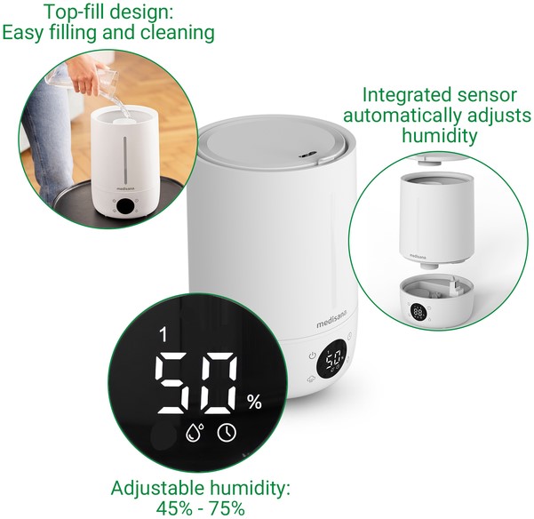 De lucht in de ruimte wordt efficiënt bevochtigd met ultrasone technologie, terwijl een geïntegreerde sensor constant de luchtkwaliteit controleert en aanpast aan de individuele behoeften. Het LED-display met aanraakbediening kan worden gebruikt om de luchtvochtigheid in te stellen tussen 45%-75% en de bevochtigingsintensiteit in drie fasen. Alle waarden kunnen eenvoudig worden afgelezen van de geïntegreerde hygrometer.
