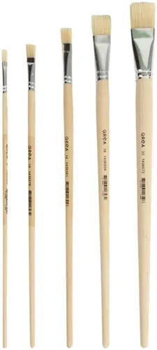 Kwastenset Qrea varkenshaar – set van 5 stuks. Ontdek de veelzijdigheid van de Qrea kwastenset, perfect voor een scala aan toepassingen in kunst en kluswerk. Elke kwast in deze set heeft een platte vorm en is uitgerust met een stevige bus van hoogwaardig plaatmetaal, wat zorgt voor maximale precisie en duurzaamheid. Het ruwe handvat van blank hout biedt een stevige grip, zelfs tijdens langdurig gebruik. Of je nu werkt met verf, primers, lak, lijm of impasto-technieken – deze set staat altijd voor je klaar en is essentieel in elke creatieve of professionele toolkit. Kenmerken:
