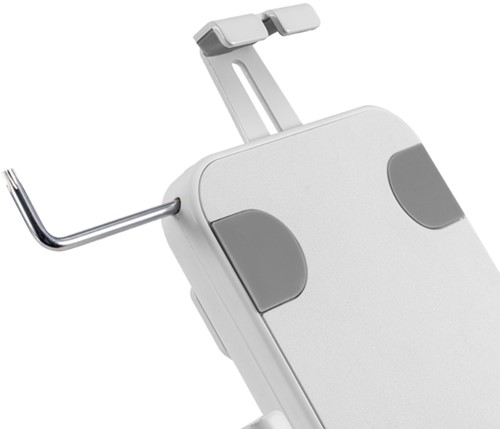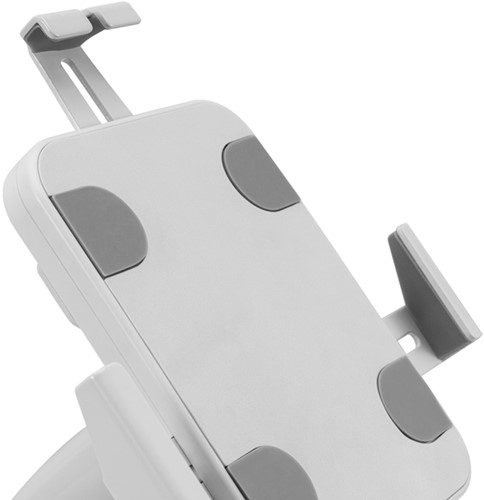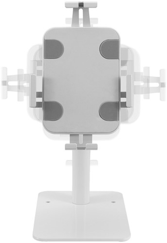 De Neomounts DS15-625WH1 is een tafelblad tablethouder die 360° kan roteren, zodat eenvoudig geschakeld kan worden tussen portrait en landscape oriëntatie. Daarnaast kan de tablethouder +20°/-110° kantelen voor een comfortabele kijkpositie. Met behulp van de schuifrail aan de achterzijde kan de tablet in het midden van de steun worden uitgelijnd. De tablethouder is voorzien van een anti-diefstalslot en een schroefbare basis voor extra veiligheid. Anti-slipkussentjes beschermen de tablet tegen eventuele krassen, terwijl de in hoogte en breedte verstelbare klemmen zorgen voor een veilige en solide plaatsing van het apparaat. De bovenzijde is voorzien van een uitsparing voor de camera van de tablet. Kabels kunnen netjes worden weggewerkt via het interne kabelmanagementsysteem. De DS15-625WH1 is geschikt voor tablets met een dikte van 0-8,5 mm.
