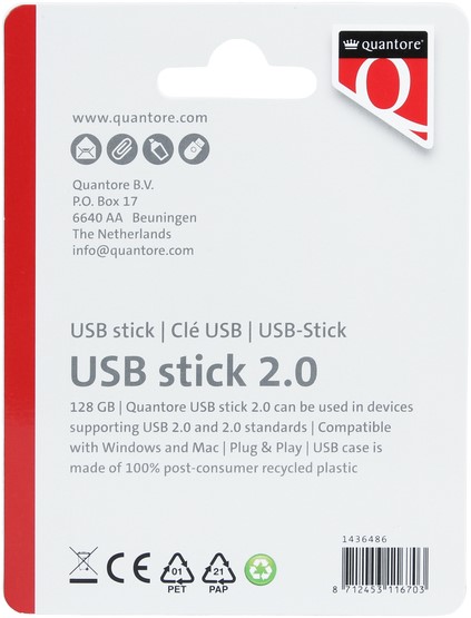 Sla je bestanden eenvoudig op met de USB-stick van Quantore. Met 128GB opslagcapaciteit en USB 2.0-technologie is deze stick perfect voor het dagelijks gebruik van documenten, foto's en video's. De compacte, lichtgewicht behuizing is gemaakt van 100% gerecycled plastic en voorzien van een beschermkapje voor extra bescherming. Dankzij Plug & Play is de USB-stick direct klaar voor gebruik op zowel Windows- als Mac-apparaten. Kenmerken: