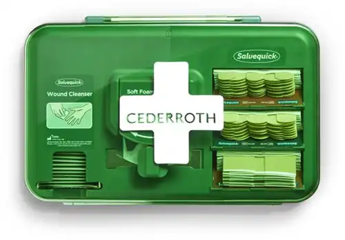 Inhoud: 1 Salvequick wondreiniger, 40 st. (REF 3227) 1 Cederroth Soft Foam Bandage, 4,5 m (REF 51011010) 1 Salvequick textielpleisters (REF 6444) 1 Salvequick plasticpleisters (REF 6036) 1 Salvequick textielpleisters (REF 6470) 1 Navulsleutel