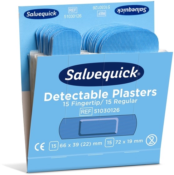 Salvequick Blue Detectable pleisters zijn in het bijzonder bedoeld voor gebruik in de levensmiddelenindustrie. De pleisters zijn detecteerbaar en worden door de meeste metaaldetectors ontdekt. Door de blauwe kleur kan de pleister ook gemakkelijk visueel worden ontdekt.