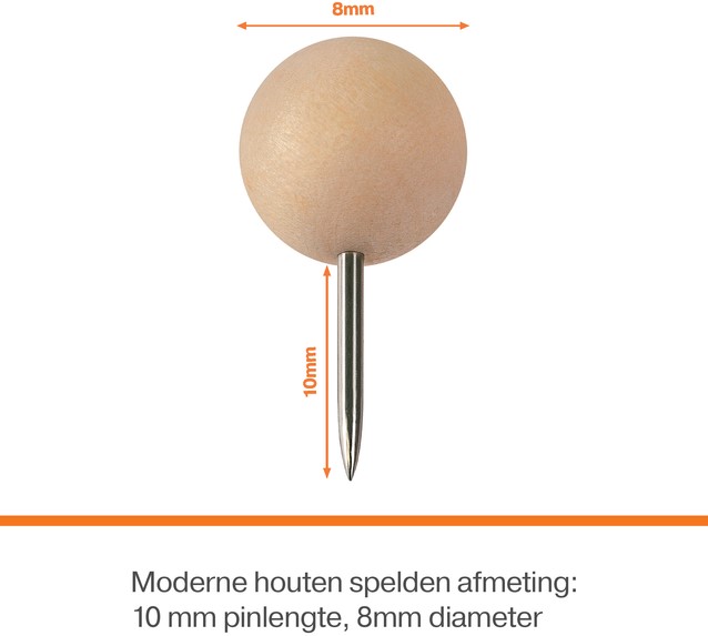 Afmeting: lengte van de pin is 10 mm en 8 mm diameter houten punaisekop.