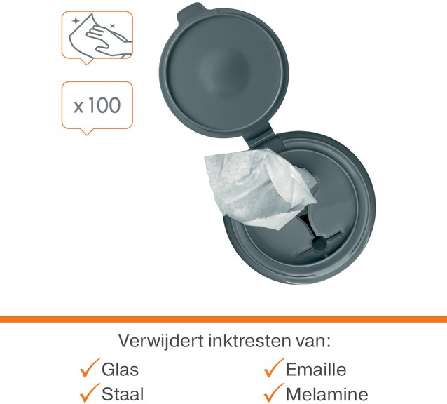 Verwijdert vuil, aanslag en inktresten van alle droog uitwisbare oppervlakken, zoals glas, email en staal.