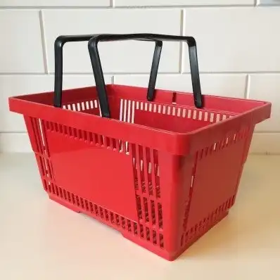Winkelmandje rood BIG met 2 handgrepen. Ral 3020. Afmeting lxbxh 48x33.5x26cm. Bodem afmeting 38x23 x h 25,5 cm. Inhoud 28 liter. Draagcapaciteit tot 10 kg.