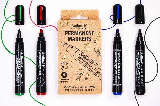 Ecologische Permanent Markers gemaakt uit 65.6% gerecycled materiaal met Dry-Safe inkt die 2 weken zonder dop kunnen blijven zonder uit te drogen. Konische punt 2mm. Kleur : zwart – rood – blauw – groen. Verpakt in Kraft doosje. Gecertifieerd door Eco Mark-label. Post consumer recycled plastic.