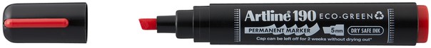 Ecologische Permanent Marker gemaakt uit 64% gerecycled materiaal met Dry-Safe inkt die 2 weken zonder dop kan blijven zonder uit te drogen. Beitelpunt 2-5mm. Kleur : rood. Gecertifieerd door Eco Mark-label. Post consumer recycled plastic.
