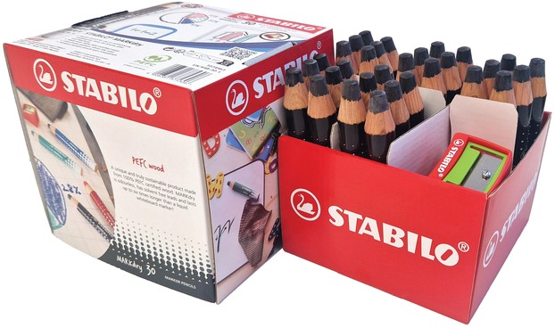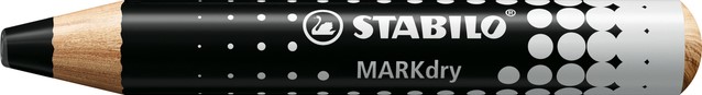 en kan makkelijk worden gewist met een droge of natte doek. Net zo gemakkelijk in gebruik als een krijtje. Danzij de stevige droge kern droogt deze marker nooit uit en garandeert een egale constante kleurafgifte tot de laatste streek. De kleur trekt niet in het papier en drukt niet door. De marker is oplosmiddelvrij, geurloos en gemaakt van 100% PEFC-gecertificeerd hout. Het perfecte alternatief voor gangbare inktmarkers. STABILO MARKdry Classpack met 30 zwarte potloden.