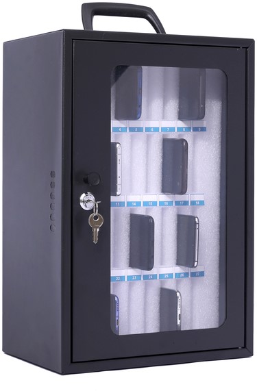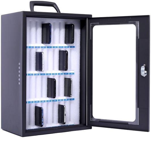 De Pavo-smartphonekluis is een efficiënte en veilige opslagoplossing die perfect is voor het opbergen van mobiele telefoons in onderwijsinstellingen, sportclubs en andere organisaties. Deze opbergkast van staal met een acryldeur is ontworpen om tot 36 smartphones op een georganiseerde en krasvrije manier op te bergen. Elk apparaat krijgt zijn eigen plek in zachte schuimcompartimenten die optimale bescherming bieden en individueel genummerd zijn, zodat gebruikers hun telefoons snel en gemakkelijk kunnen terugvinden. De kluis is beveiligd met een sleutelslot, waardoor een veilige opslag tijdens lessen of trainingen wordt gegarandeerd. Hij kan worden gebruikt als draagbare optie, omdat hij is uitgerust met een handvat, of aan de muur worden bevestigd voor extra veiligheid en ruimtebesparing. De kluis is zeer geschikt voor het tijdelijk opbergen van smartphones op scholen, (sport)clubs, klinieken en andere plaatsen waar telefoons niet zijn toegestaan.