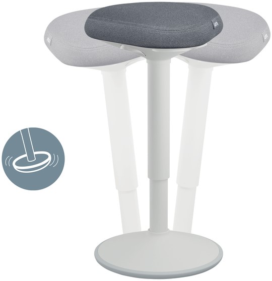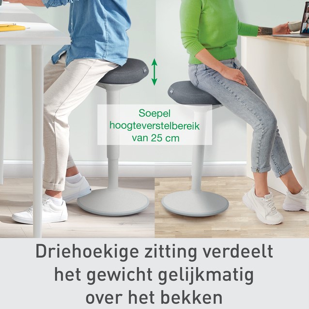 De Leitz Ergo wiebelkruk met gasveer heeft een unieke DDF-comfortzitting (Dual Density Foam) met een stevige ergonomische kern. De driehoekige vorm lijkt op een zadelkruk, verdeelt het gewicht gelijkmatig over het bekken en is omgeven door zacht schuim om de druk op de dijen en benen te verminderen. De 9cm dikke zitting is ontworpen voor comfort en kan worden gebruikt om te leunen of volledig te zitten. Dit stimuleert gebruikers om meer rechtop te zitten en biedt een ultracomfortabele zitervaring die lijkt op een zitkussen. De afgeronde schommelende basis van de wiebelkruk stimuleert actieve beweging door te draaien terwijl je werkt, wat je rug en core versterkt en pijn voorkomt. De bekleding van de zitting is gemaakt van 100% gerecycled materiaal. Deze moderne en minimalistische wiebelkruk is ideaal voor thuis of op kantoor om het comfort te verhogen en de productiviteit te maximaliseren.