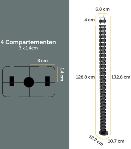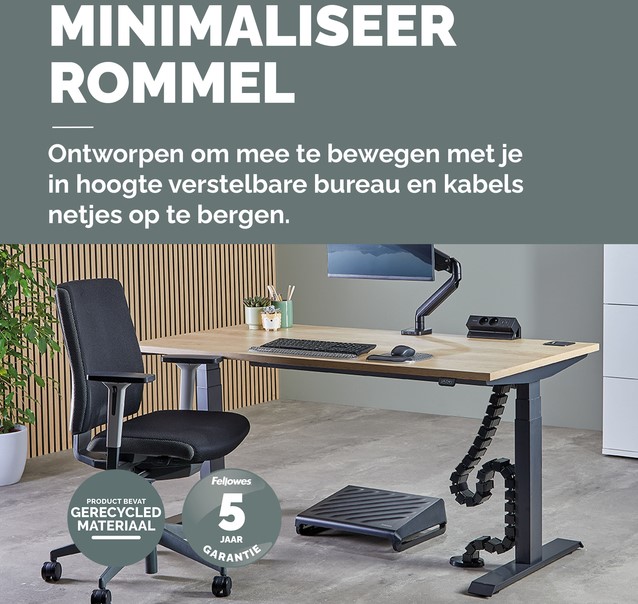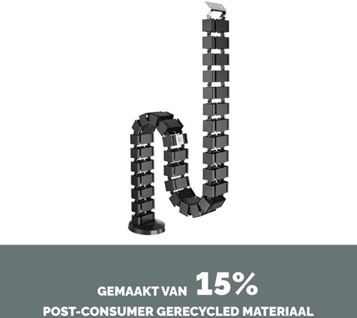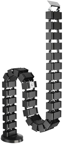 Organiseer en leid kabels moeiteloos van de vloer naar het bureau met deze kabelslang voor een schone, opgeruimde werkplek. Flexibele slang past zich aan aan bureaus (tot 130cm) die in hoogte verstelbaar zijn en beweegt naadloos mee als de bureauhoogte verandert. Vier gescheiden compartimenten houden kabels vrij van wirwar, terwijl de open slang gemakkelijk kabels kan toevoegen of verwijderen. Afneembare onderdelen - 31- in elkaar te klikken delen zodat je de hoogte kunt aanpassen aan je bureau. Verzwaarde voetplaat voor extra stabiliteit. Ingebouwde magneet bevestigt de kabelslang aan de tafelpoot, zodat hij niet in de weg zit.