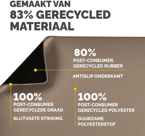 Ruime bureaumat beschermt tegen vuil en krassen en zorgt voor een niet-reflecterend werkoppervlak. Biedt een comfortabel oppervlak om te schrijven en te typen en verbetert de prestaties van de muis. Ingebouwde Microban®-bescherming helpt de groei van bacteriën te voorkomen en werkt 24/7 voor een extra niveau van productbescherming. Gemaakt van 83% gerecycled materiaal. Antislip onderkant houdt de mat de hele dag op zijn plaats. Duurzame platte stiksels voorkomen rafelen. Gemaakt om lang mee te gaan, met 5 jaar garantie.