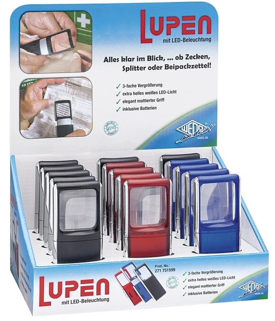 WEDO rechthoekige loepen met led-verlichting. Het extra heldere witte led-licht wordt ingeschakeld door eenvoudig het bovenste deel van de behuizing omhoog te trekken. De kunststof lens van ongeveer 3.5x3.8cm vergroot 3 keer. De elegante, platte behuizing van mat kunststof ligt licht en prettig in de hand.