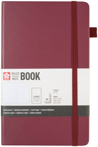 Het Sakura harde kaft notitieboek is een journal van hoge kwaliteit. Het notitieboek heeft 80 vellen FSC-gecertificeerd papier, licht crèmewit van kleur voor optimale leesbaarheid. De klassieke regelafstand (7 mm) zorgt voor comfortabel schrijven met voldoende ruimte om je handschrift gemakkelijk opnieuw te lezen. Het stevige 140 g/m² zuurvrije papier voor het maken van aantekeningen en het bijhouden van gegevens is vrijwel geschikt voor elk type peninkt, waardoor je schrijfwerk niet doordrukt. Het Sakura notitieboek heeft een moerbeikleurige harde kaft met afgeronde hoeken, een elastische sluitband, een leeslint en een uitbreidbare pocket aan de achterkant voor het verzamelen van losse aantekeningen. Afmeting: Large - 21 x 14 cm
