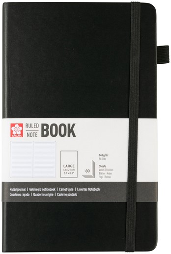 Het Sakura harde kaft notitieboek is een journal van hoge kwaliteit. Het notitieboek heeft 80 vellen FSC-gecertificeerd papier, licht crèmewit van kleur voor optimale leesbaarheid. De klassieke regelafstand (7 mm) zorgt voor comfortabel schrijven met voldoende ruimte om je handschrift gemakkelijk opnieuw te lezen. Het stevige 140 g/m² zuurvrije papier voor het maken van aantekeningen en het bijhouden van gegevens is vrijwel geschikt voor elk type peninkt, waardoor je schrijfwerk niet doordrukt. Het Sakura notitieboek heeft een zwartkleurige harde kaft met afgeronde hoeken, een elastische sluitband, een leeslint en een uitbreidbare pocket aan de achterkant voor het verzamelen van losse aantekeningen. Afmeting: Large - 21 x 14 cm