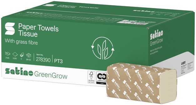 Afmeting ongevouwen: 250x230mm Satino GreenGrow is hoogwaardig hygiënepapier met bijzonder duurzame eigenschappen. Producten uit deze productlijn wordt gemaakt van gerecycled papier, aangevuld met verse vezels van Miscanthus-gras. Deze grassoort wordt lokaal geteeld in West-Europa en de bodem wordt niet bemest, geploegd, bespoten of ingezaaid. Met een levensduur van vijftien tot twintig jaar lang groeit dit supergewas ieder jaar tot wel 4 meter hoog, waardoor het de bijnaam 'Olifantengras' heeft gekregen.