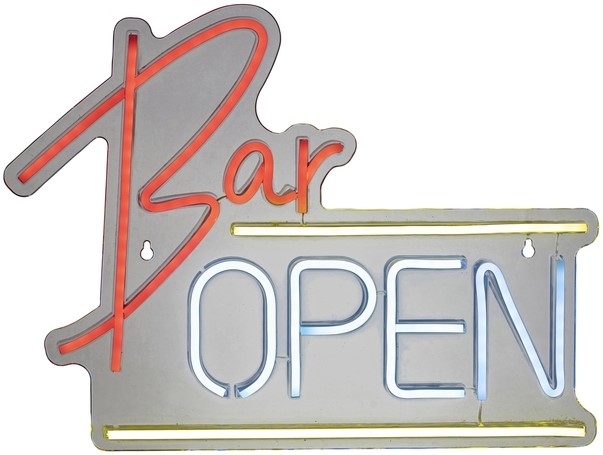 Neon ledbord met de tekst: Bar Open. Een kleurrijk spel van licht dat levendigheid en sfeer brengt in elke kamer. Deze Lumineo Neon is ontworpen voor binnengebruik en werkt op batterijen, met prioriteit voor flexibiliteit en gemak. De verlichting, met 220 kleine SMD LED's, straalt een speels palet van meerdere kleuren uit en zorgt voor een opvallende, stijlvolle uitstraling. Dankzij het lichte plastic en het wit aansluitsnoer past deze decoratie moeiteloos in diverse interieurs, terwijl de eenvoudige bediening direct comfort en plezier biedt. USB aansluiting