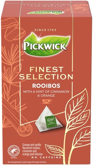 Pickwick Finest Selection Rooibos is een blend van Rooibos verrijkt met een subtiel vleugje kaneel en sinaasappelschil. Deze blend is geselecteerd om zijn zachte en natuurlijke smaak en bevat geen cafeïne.