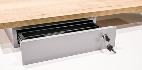 Met deze persoonlijke lade zorg je voor extra opbergruimte en zijn je spullen veilig opgeborgen. De lade is zowel links als recht te monteren onder het bureau middels schroeven. De lade is afsluitbaar met een unieke sleutel. Nooit meer rommel op je bureau met deze persoonlijke lade. Met een totale afmeting van 390x295x90mm biedt dit voldoende ruimte om je spullen in op te bergen. Specificaties: