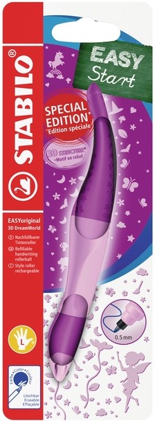 Leren schrijven wordt makkelijk gemaakt. De STABILO EASYoriginal rollerball 3D DreamWorld, met speciale versies voor rechtshandige en linkshandige kinderen, is gemaakt om kinderen die leren schrijven te helpen bij het ontwikkelen van een net en leesbaar handschrift. De ergonomische, anti-slip gripzone biedt een stevige houvast, ondersteunt intuïtief de juiste pengreep met zijn verzonken gripzones en voorkomt vroegtijdige vermoeidheid van de spieren en pijn of kramp bij het schrijven. De lichtheid waarmee de pen over het papier glijdt, helpt kinderen om vloeiend te schrijven. De inktstroom is ook speciaal ontworpen voor degenen die leren schrijven, waardoor de letters niet vlekkerig worden en er een schoon handschrift ontstaat. De bal in de punt van de rollerball geeft alleen inkt af wanneer deze op het papier wordt geplaatst. Hierdoor behoren inktvlekken op het papier tot het verleden. Elke keer dat de pen wordt bijgevuld, worden zowel de vulling als de punt van de pen vervangen.