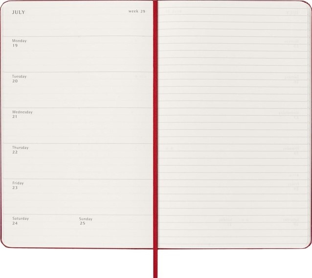 De Moleskine Weekly Notebook Planner is gedateerd van januari tot december. Het is een handige en veelzijdige planner die de vrijheid van een notitieboekje bevat en is ingedeeld met de afspraken van de week aan de linkerkant en een gelinieerde pagina voor notities op de rechter bladzijde. Het notitieboekje is beschikbaar met een harde of een zachte kaft met afgeronde hoeken en een elastische sluiting. - Harde of Zachte kaft - Afgeronde hoeken - Elastische sluiting - Moleskine ivoorkleurig papier - Papiergewicht: 70 g/m² - Handige tools: planning, tijdzones, internationale metingen, toegangscodes en vluchtduur - Uitbreidbaar binnenvak passend bij de kleur van het notebook - "In geval van verlies" label gedrukt op het schutblad - Bijpassende bladwijzer voor lint - Herbruikbare paperband B-SIDE met extra gedrukte tools - 180° liggende opening - Moleskine srl. creëert en verkoopt FSC-gecertificeerde producten