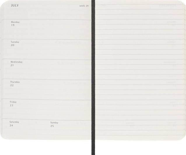 De Moleskine Weekly Notebook Planner is gedateerd van januari tot december. Het is een handige en veelzijdige planner die de vrijheid van een notitieboekje bevat en is ingedeeld met de afspraken van de week aan de linkerkant en een gelinieerde pagina voor notities op de rechter bladzijde. Het notitieboekje is beschikbaar met een harde of een zachte kaft met afgeronde hoeken en een elastische sluiting. - Harde of Zachte kaft - Afgeronde hoeken - Elastische sluiting - Moleskine ivoorkleurig papier - Papiergewicht: 70 g/m² - Handige tools: planning, tijdzones, internationale metingen, toegangscodes en vluchtduur - Uitbreidbaar binnenvak passend bij de kleur van het notebook - "In geval van verlies" label gedrukt op het schutblad - Bijpassende bladwijzer voor lint - Herbruikbare paperband B-SIDE met extra gedrukte tools - 180° liggende opening - Moleskine srl. creëert en verkoopt FSC-gecertificeerde producten