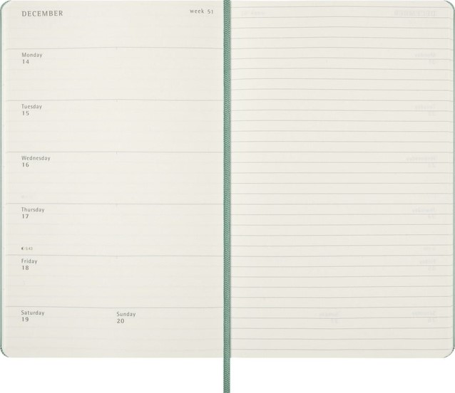 De Moleskine Weekly Notebook Planner is gedateerd van januari tot december. Het is een handige en veelzijdige planner die de vrijheid van een notitieboekje bevat en is ingedeeld met de afspraken van de week aan de linkerkant en een gelinieerde pagina voor notities op de rechter bladzijde. Het notitieboekje is beschikbaar met een harde of een zachte kaft met afgeronde hoeken en een elastische sluiting. - Harde of Zachte kaft - Afgeronde hoeken - Elastische sluiting - Moleskine ivoorkleurig papier - Papiergewicht: 70 g/m² - Handige tools: planning, tijdzones, internationale metingen, toegangscodes en vluchtduur - Uitbreidbaar binnenvak passend bij de kleur van het notebook - "In geval van verlies" label gedrukt op het schutblad - Bijpassende bladwijzer voor lint - Herbruikbare paperband B-SIDE met extra gedrukte tools - 180° liggende opening - Moleskine srl. creëert en verkoopt FSC-gecertificeerde producten