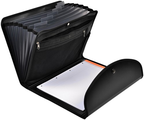Voorordner voorzien van een klembord en notitieblok, een vakje met ritssluiting en een pennenhouder.